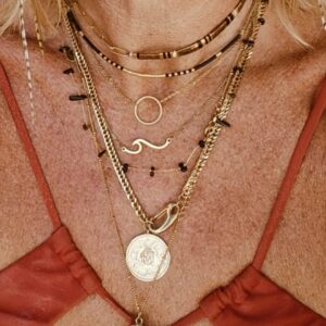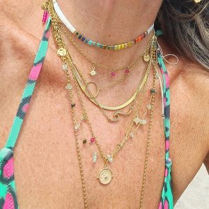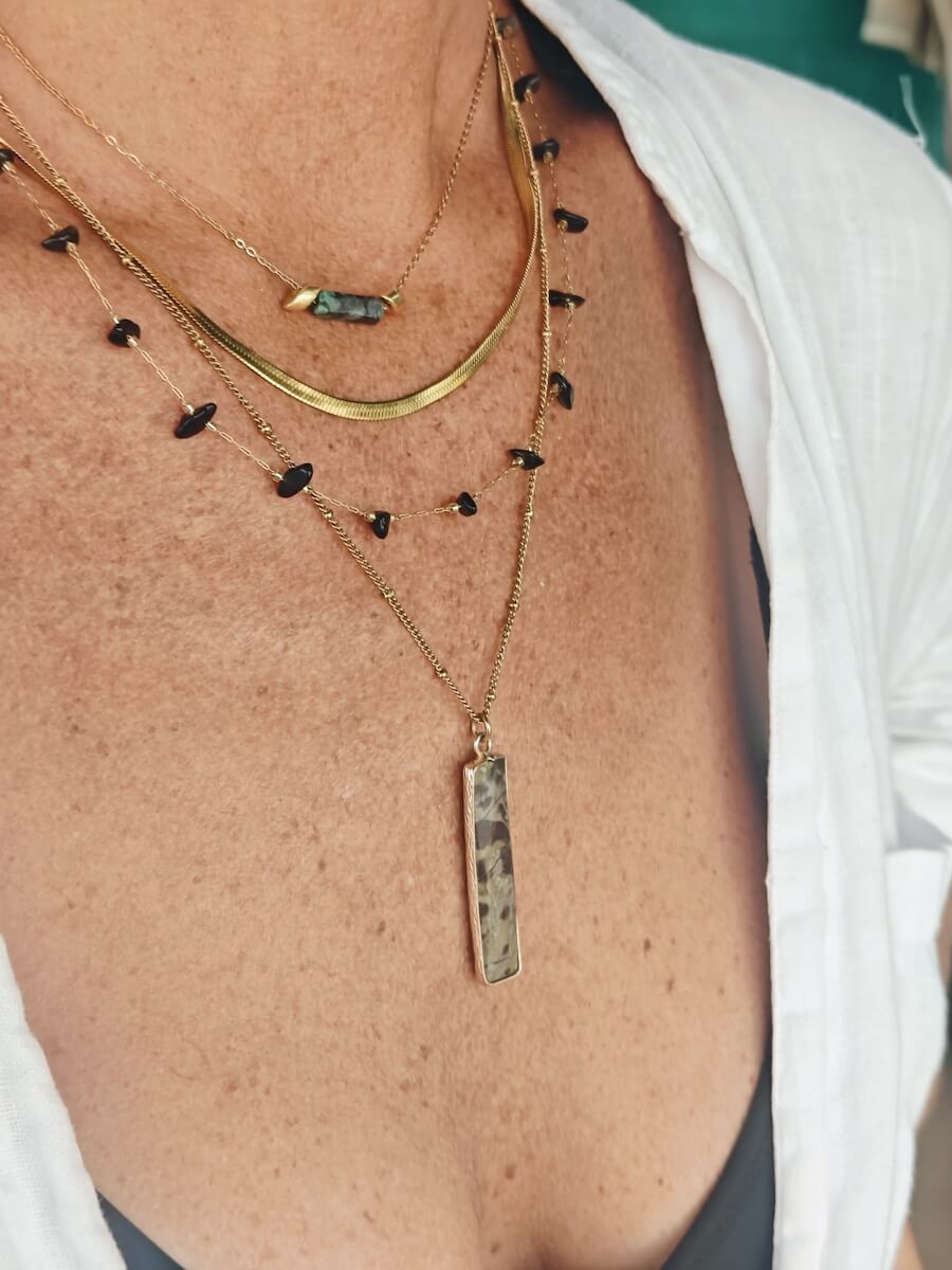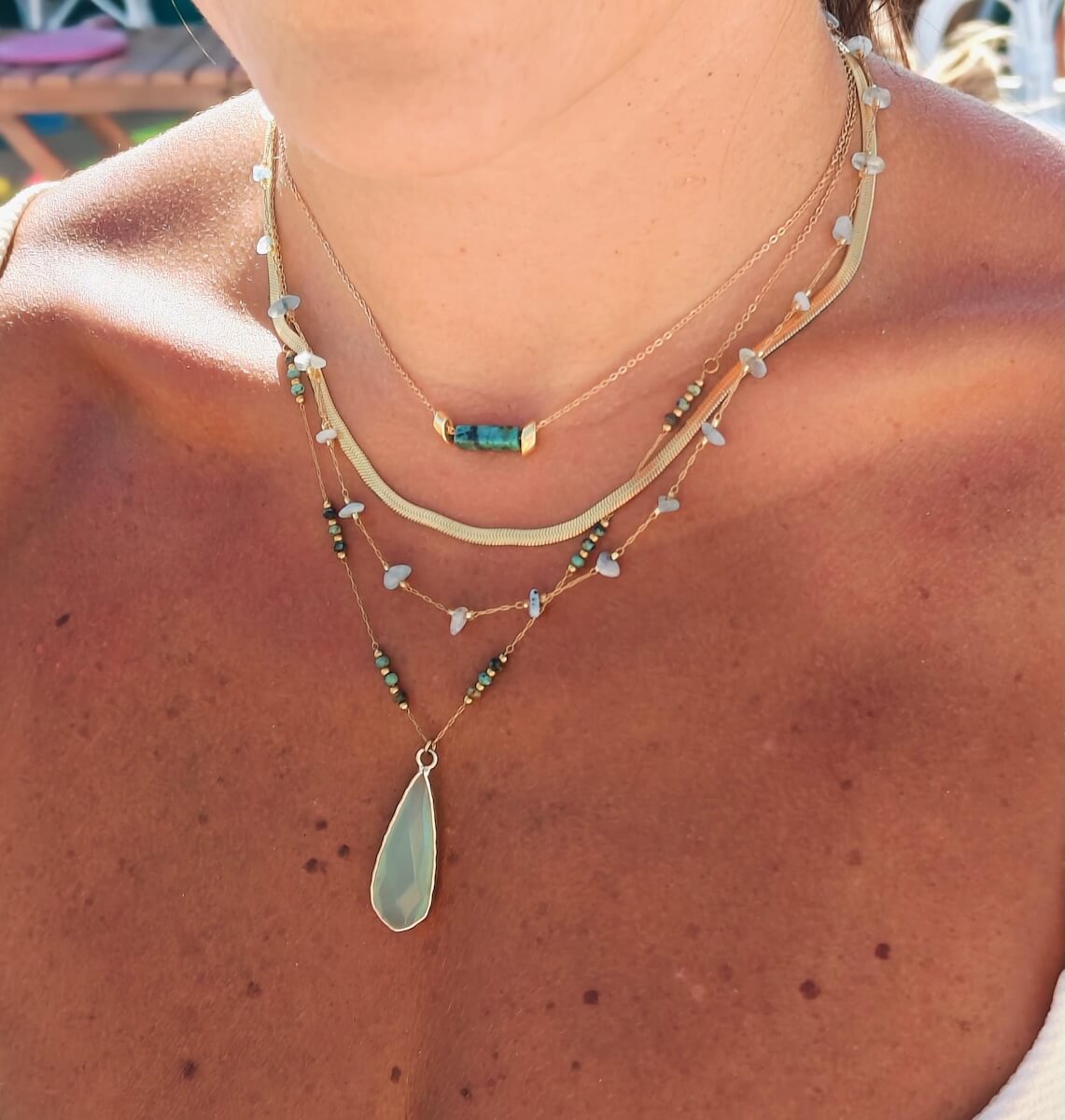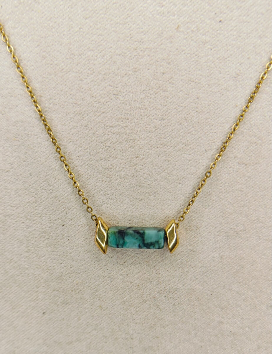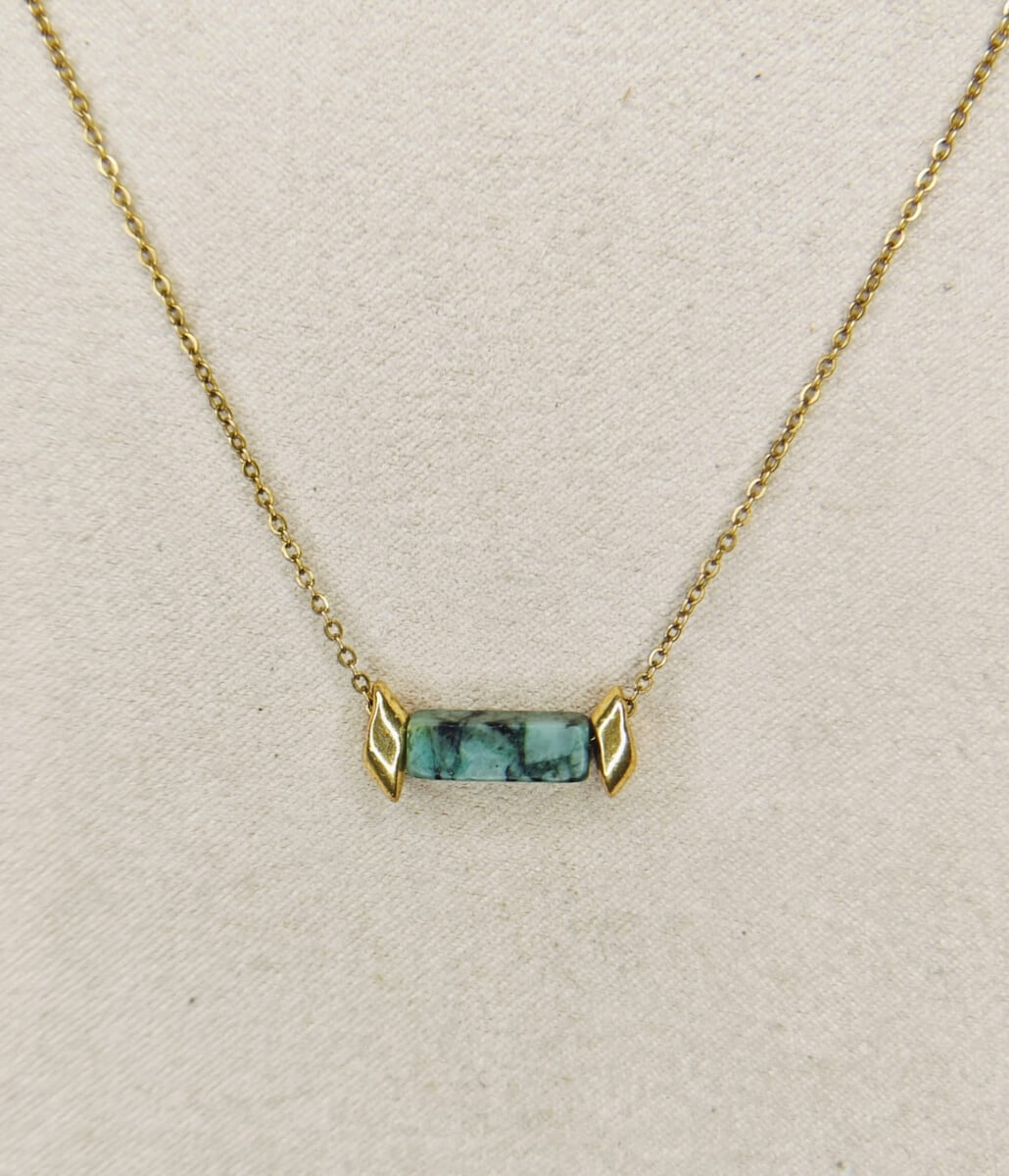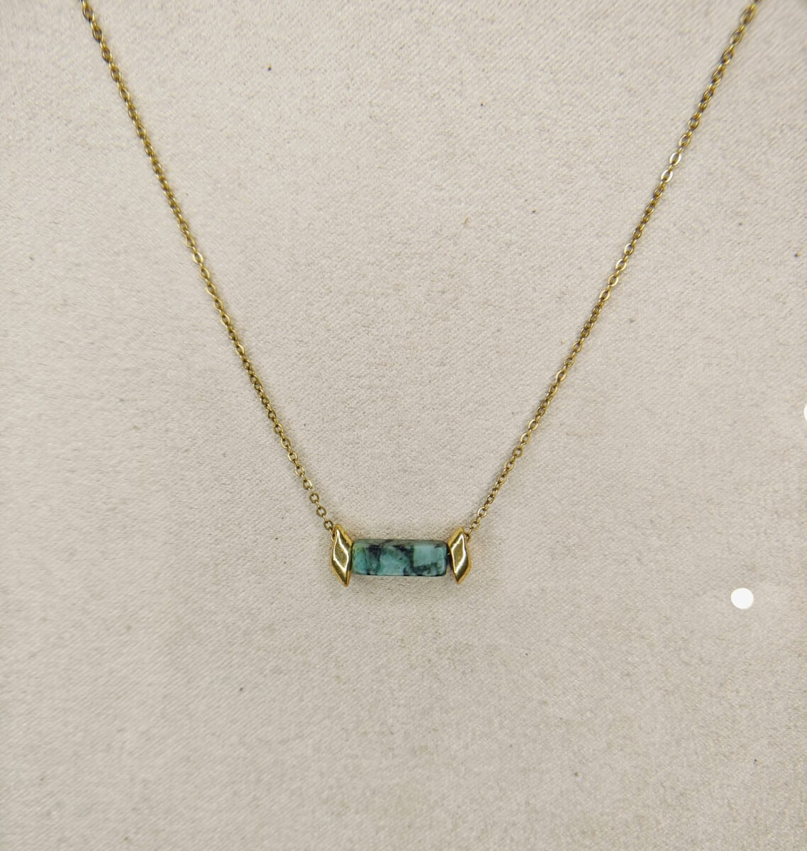 Collar Cuboide en piedra Turquesa Africana con cadena en acero inoxidable con baño de oro 18 quilates.