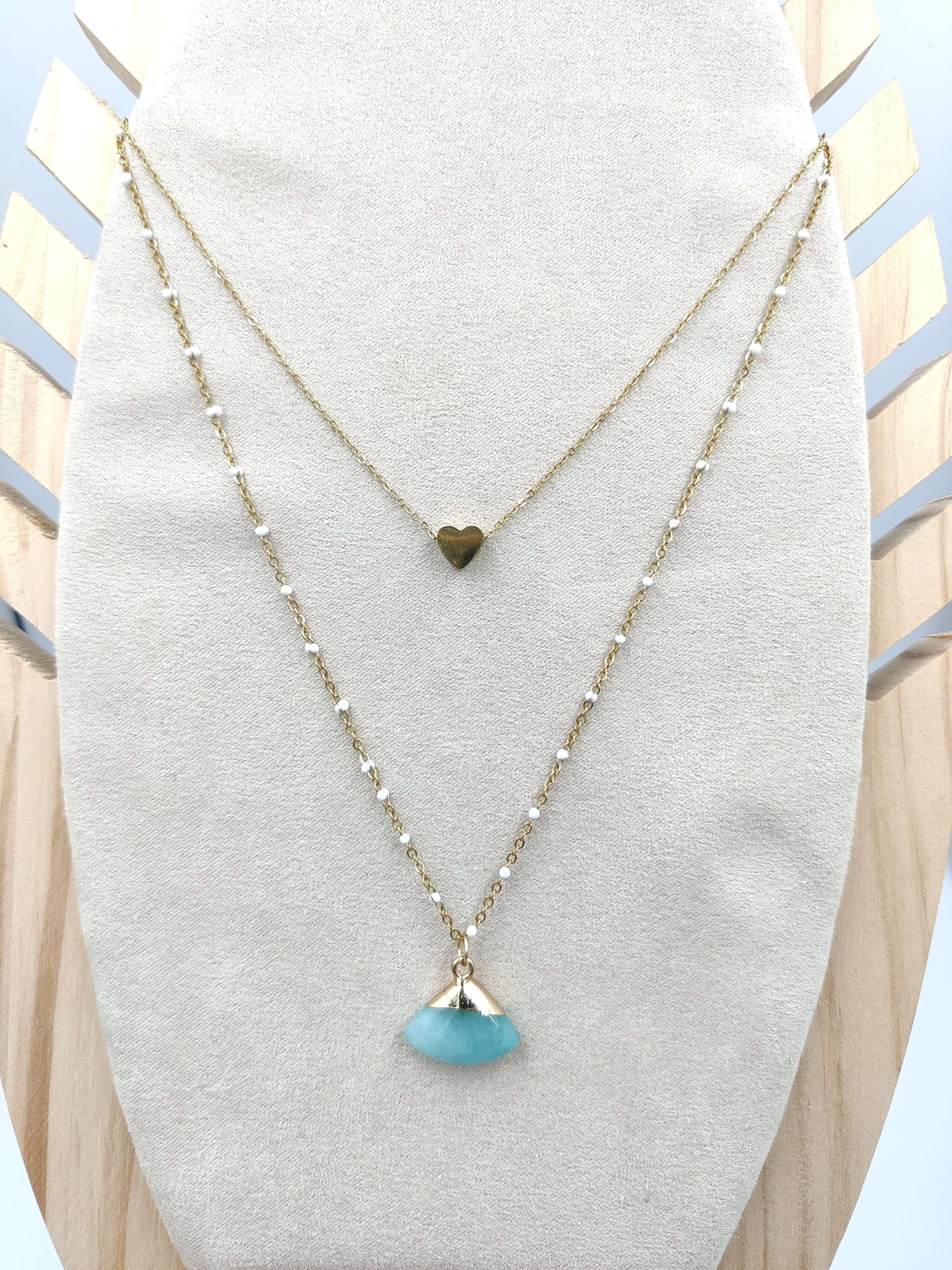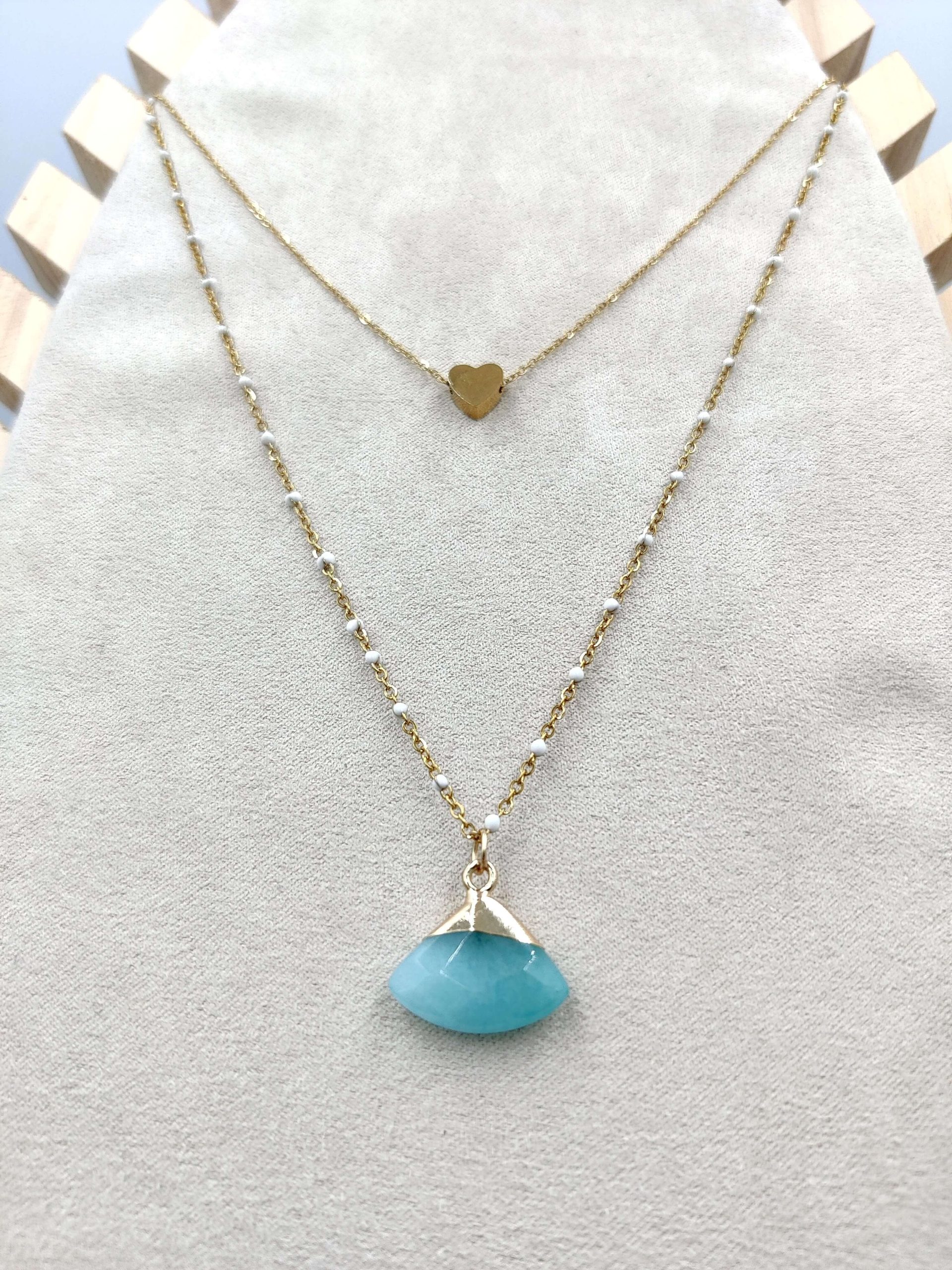 Collar Doble con dije y piedra semi preciosa Aquamarina en acero inoxidable con baño de oro 18 quilates.