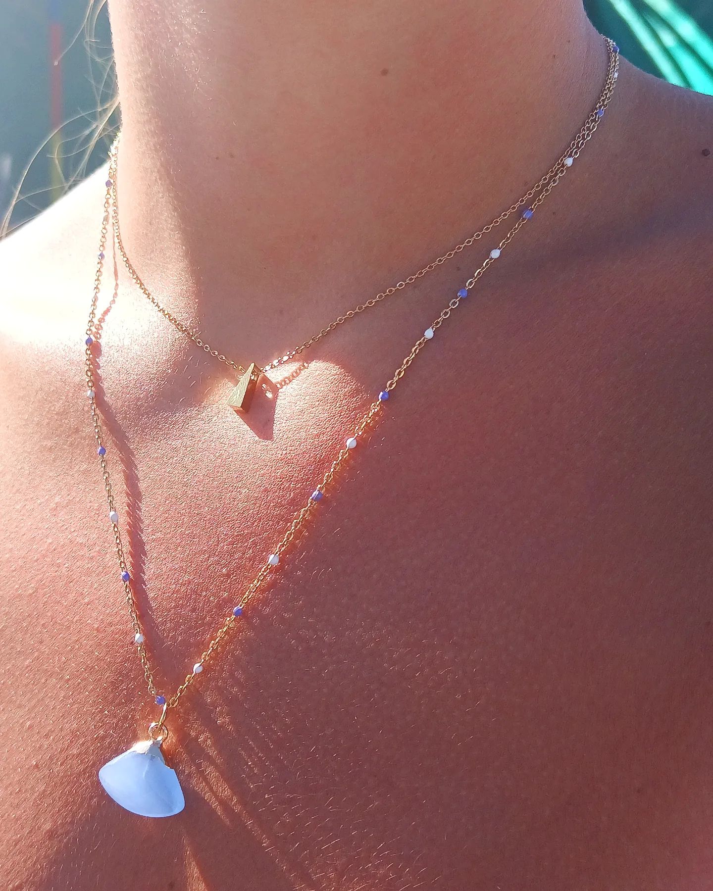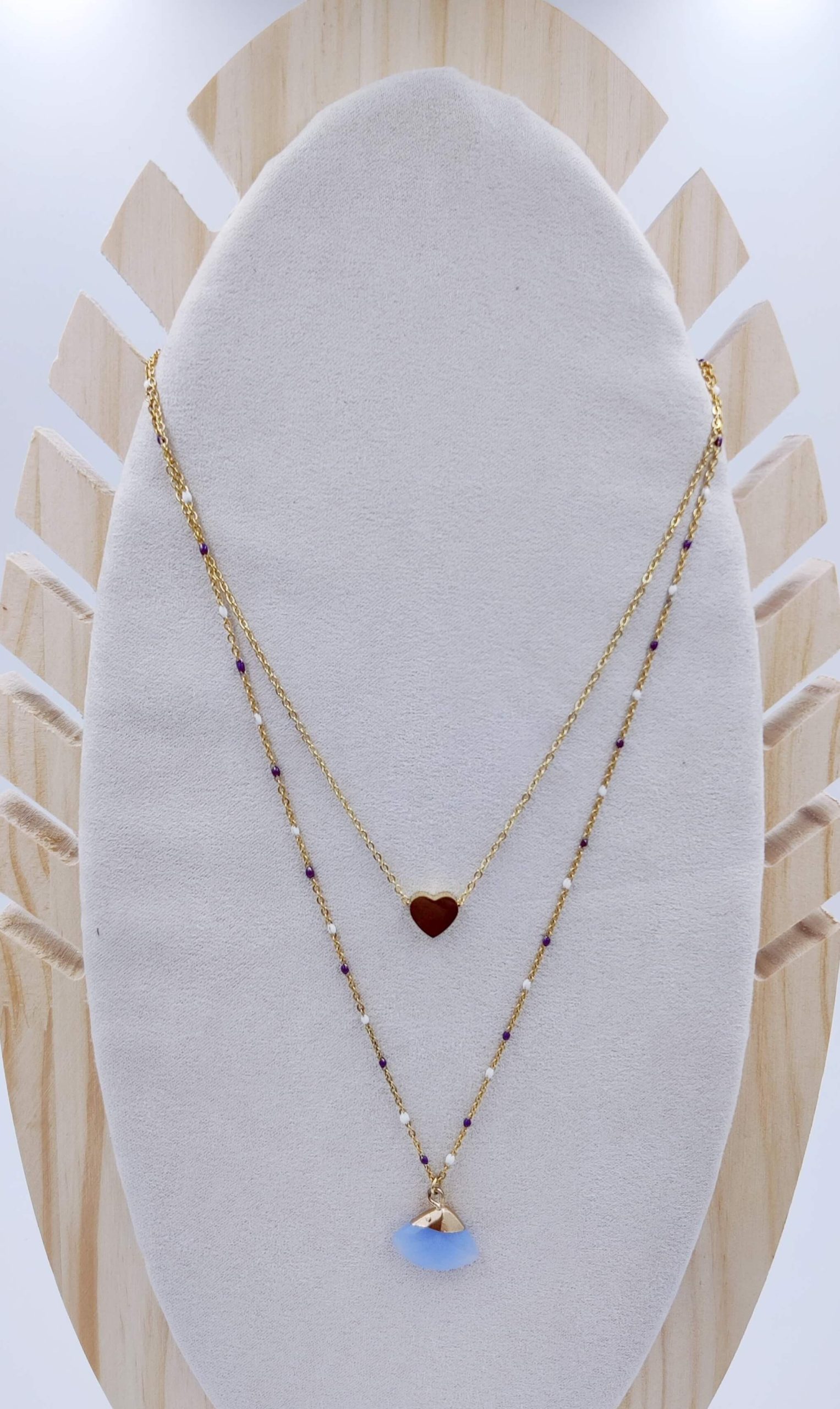 Collar Doble con dije y piedra semi preciosa Jade en acero inoxidable con baño de oro 18 quilates. Podés elegir el dije entre corazón o triángulo