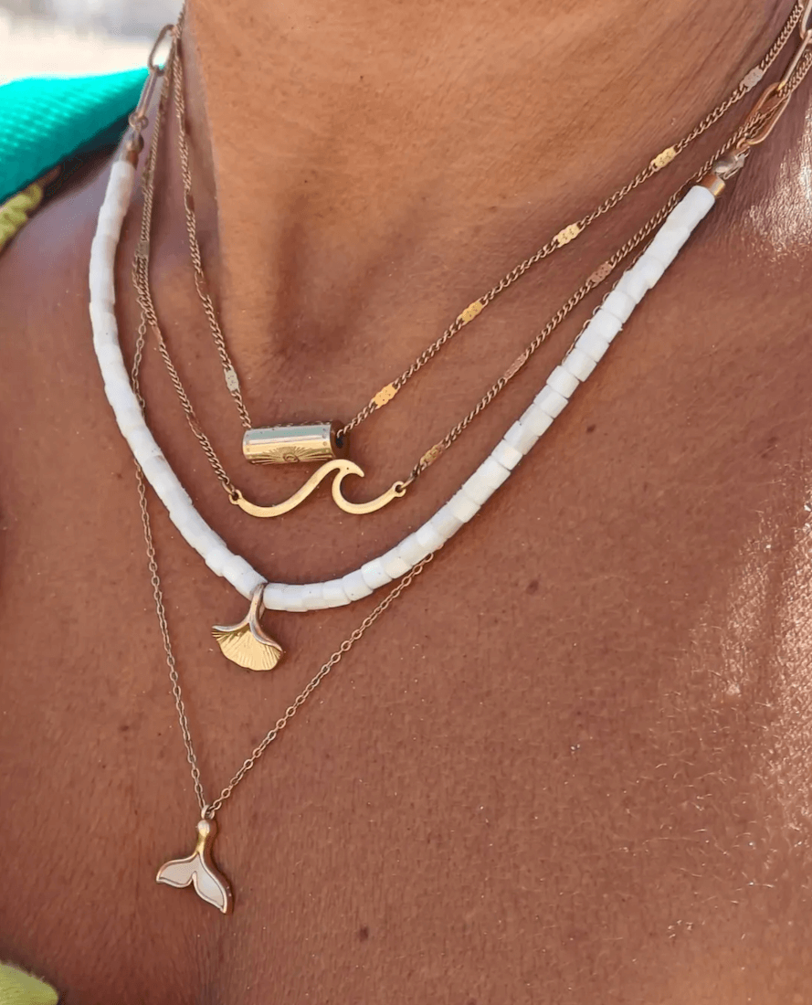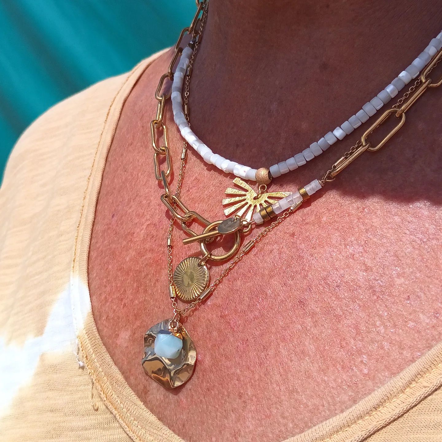 Colar nácar blanco con cadena de eslabones en acero inoxidable con baño de oro 18 quilates. Con dije de acero inoxidable con baño de oro 18 quilates