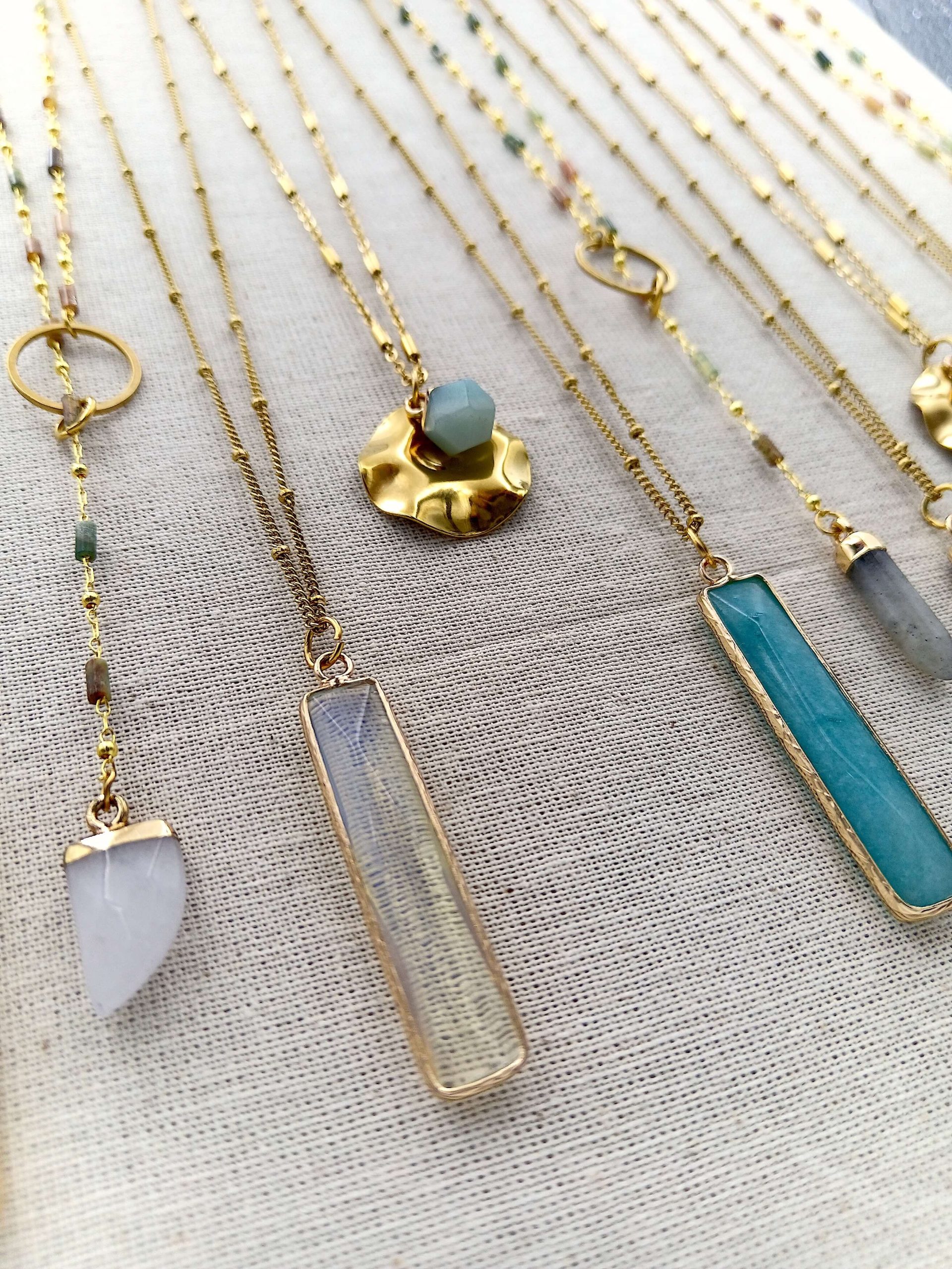 Collar Piedra Alargada con piedra semi preciosa con cadena de diseño bolitas, tipo rosario en acero inoxidable con baño de oro 18 quilates.
