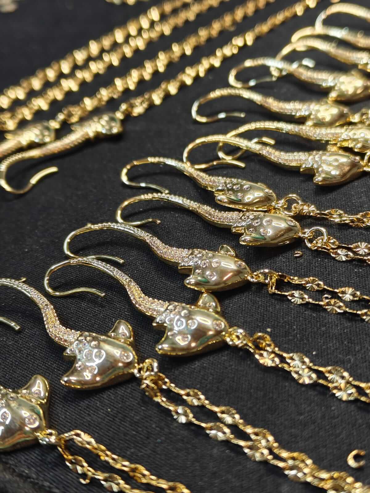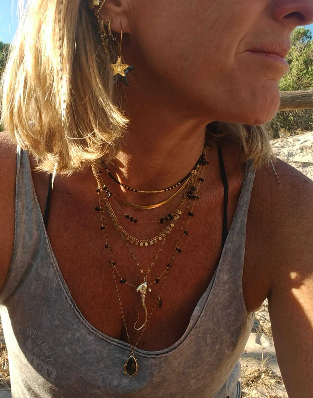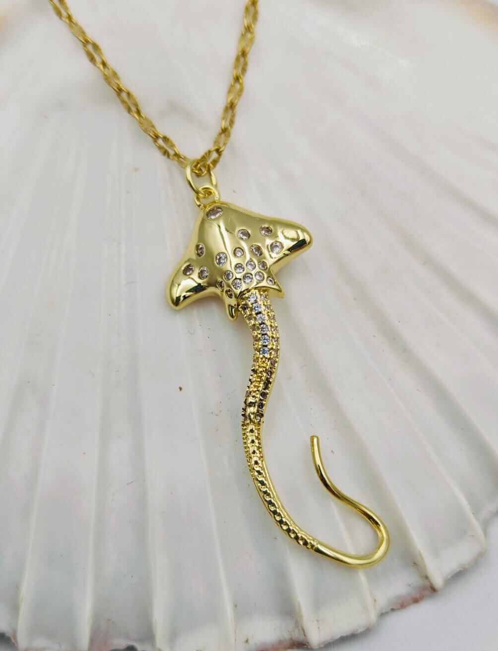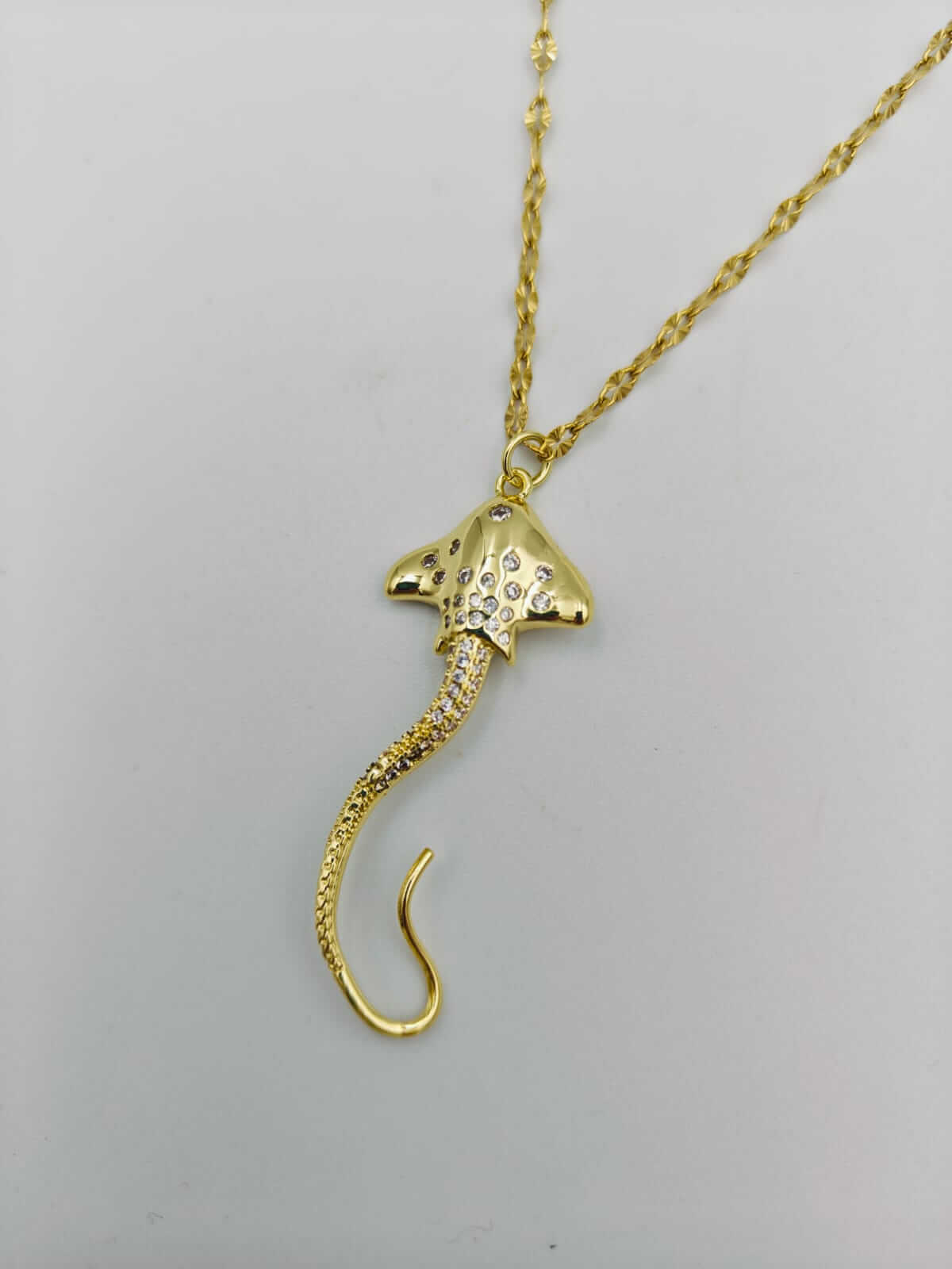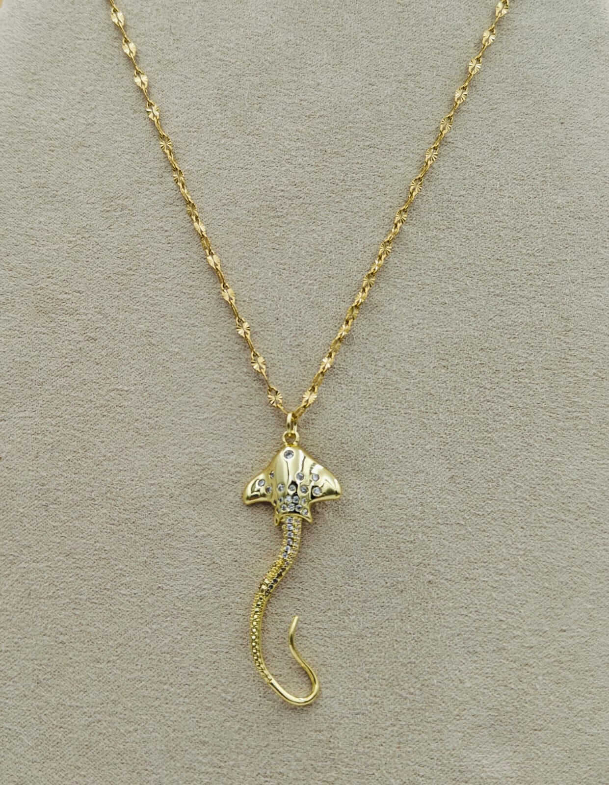 Collar Seichelles con dije Manta Raya con zirconias y con cadena de diseño Grano de Café en acero inoxidable con baño de oro 18 quilates.
