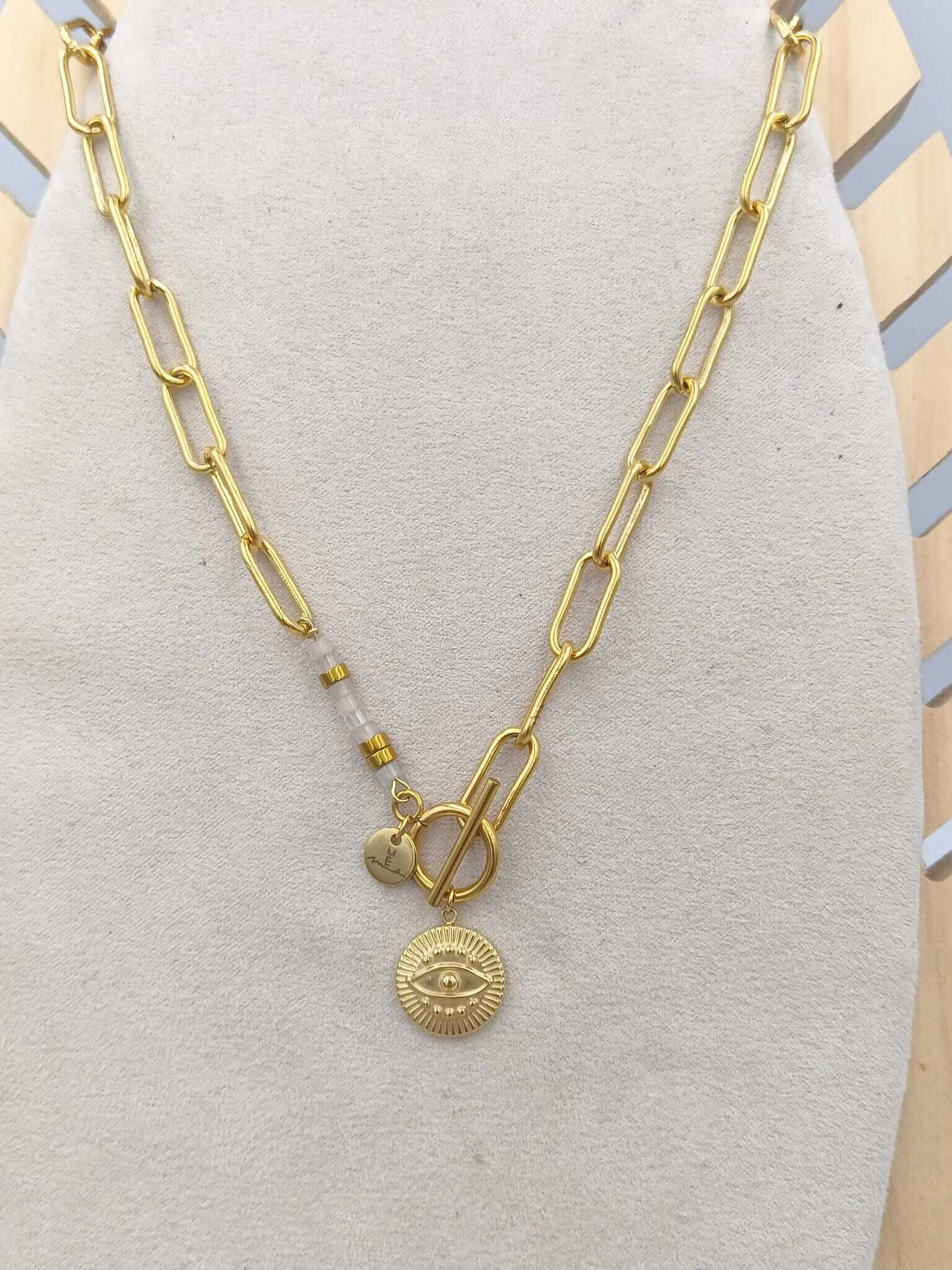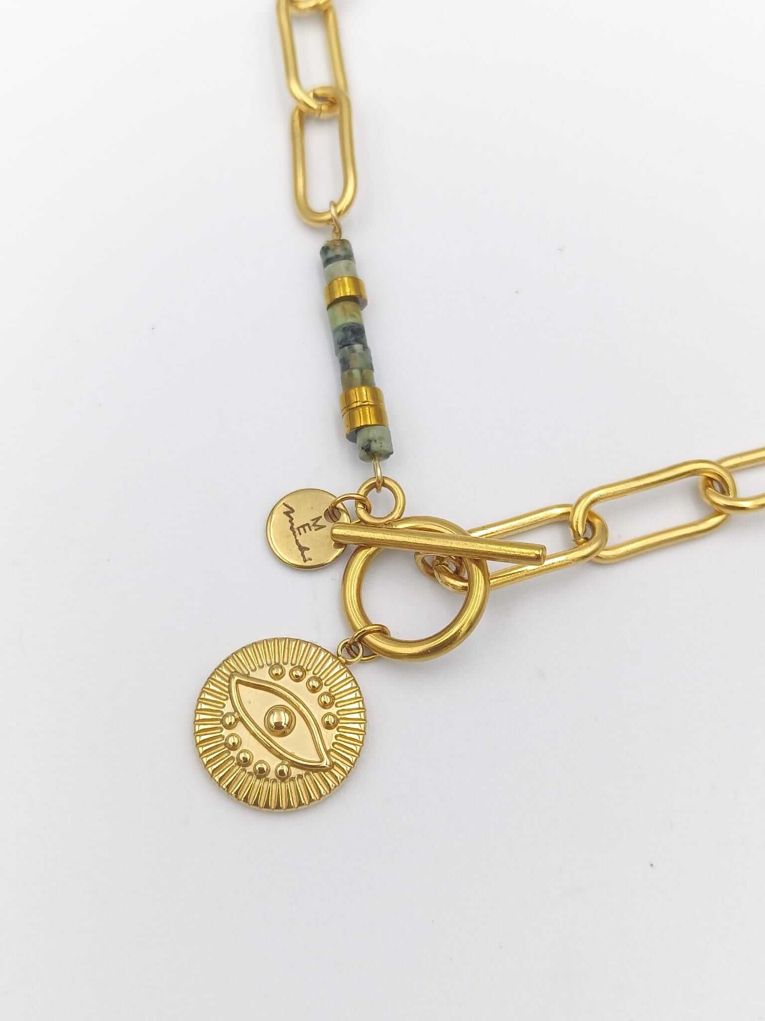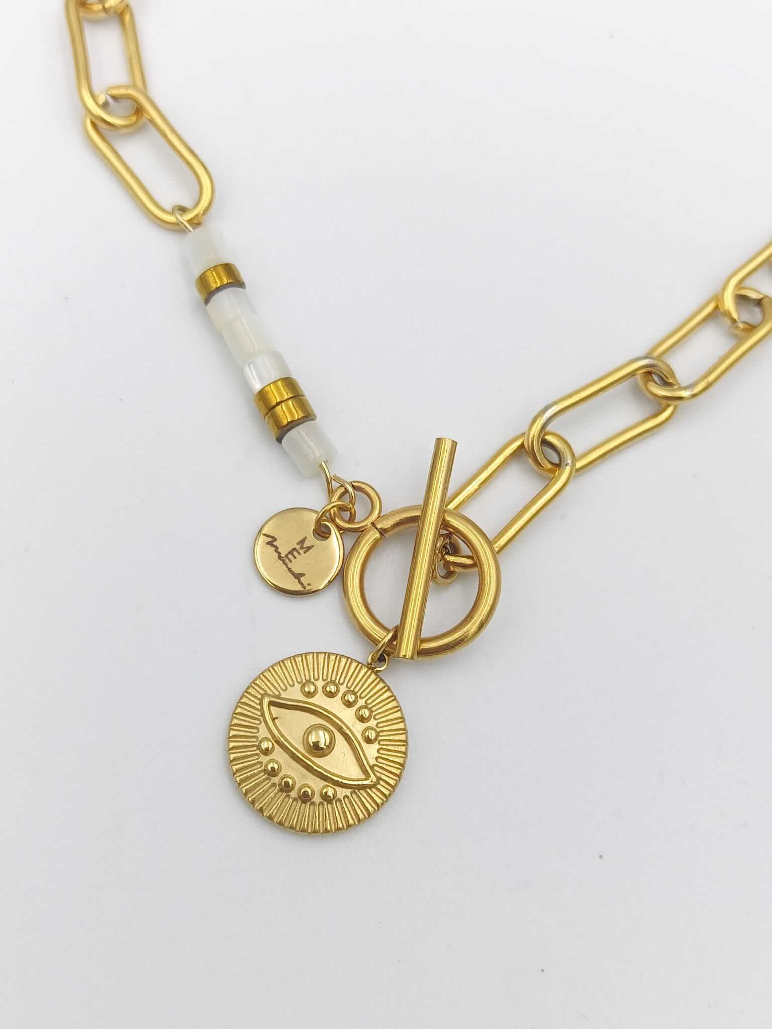 Collar Toggle con piedras Heishi y Hematites en cadena de eslabones XL en acero inoxidable con baño de oro 18 quilates Medida del collar 45cm + Cadena de Alargue de 5cm