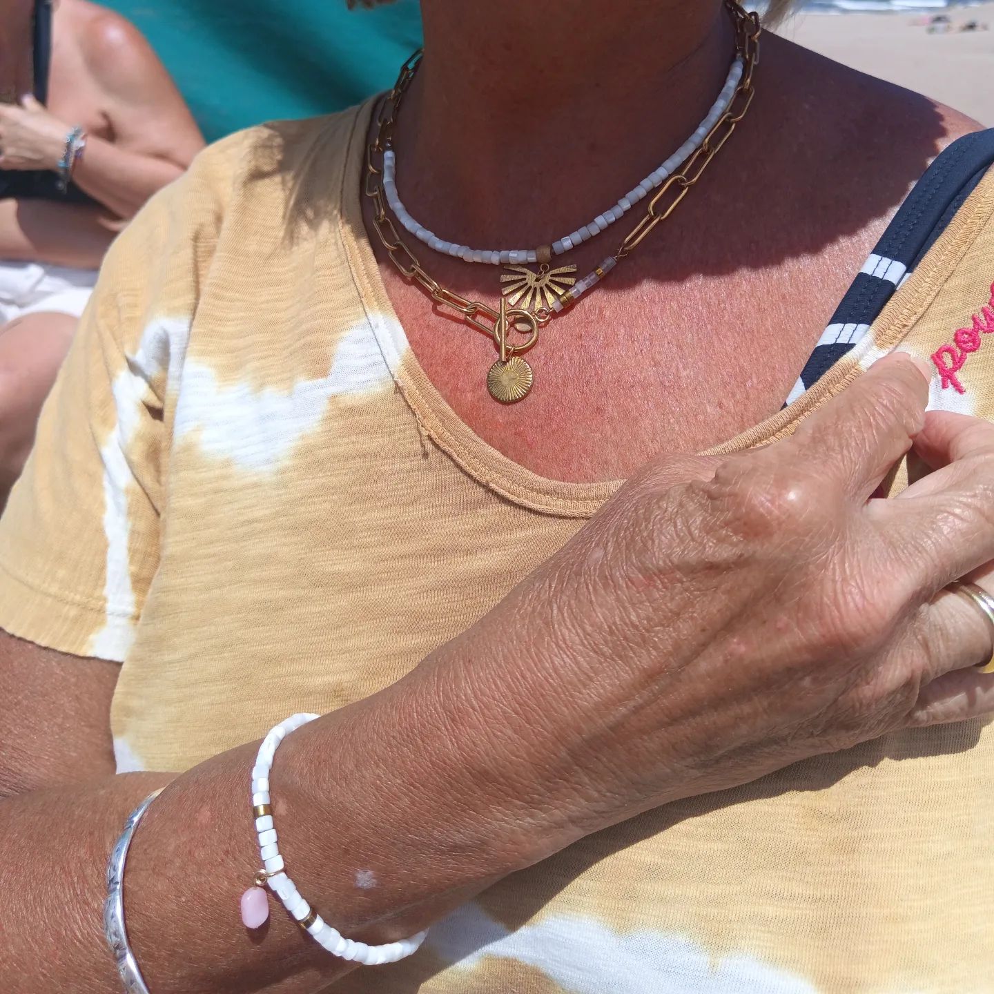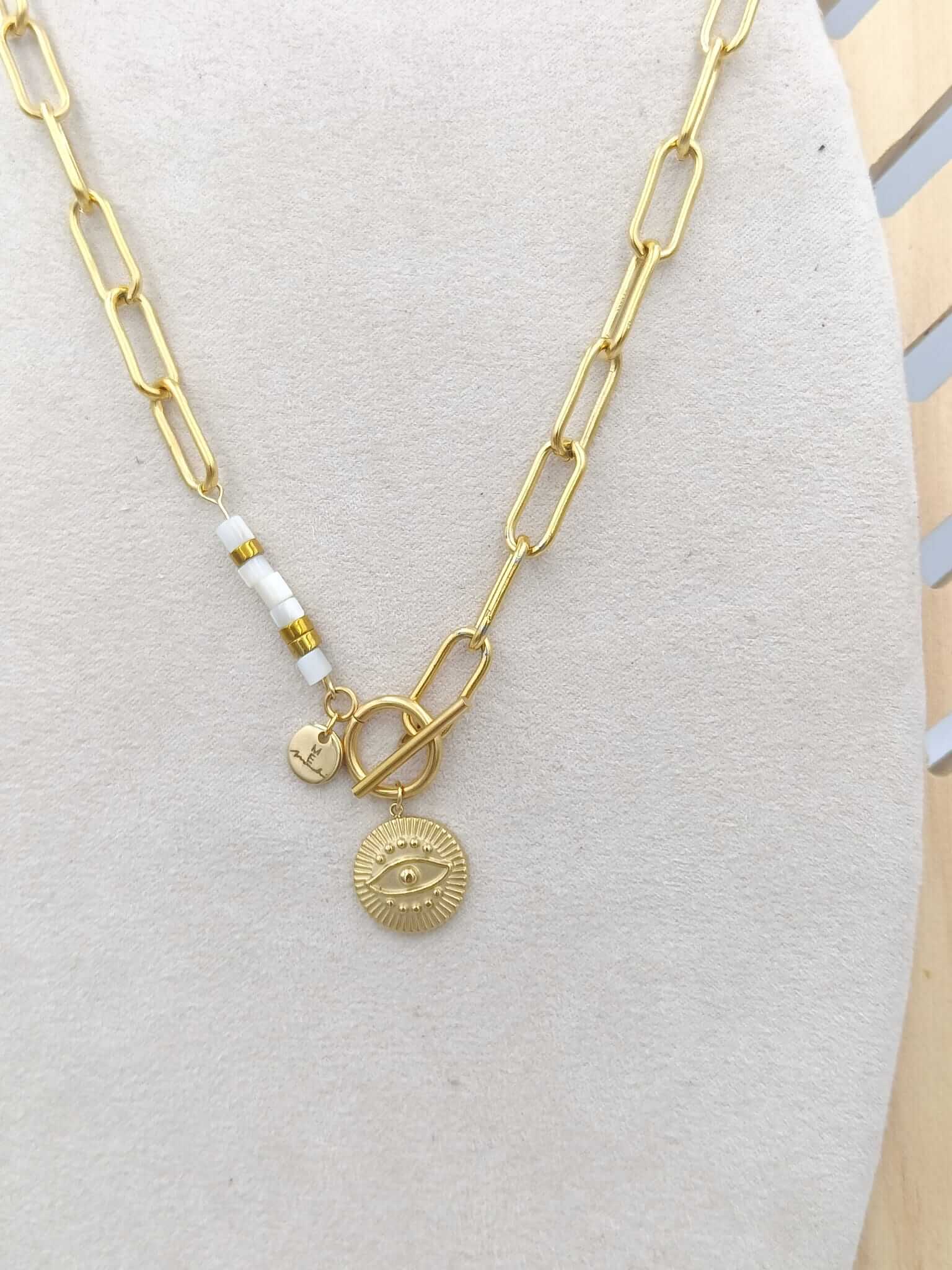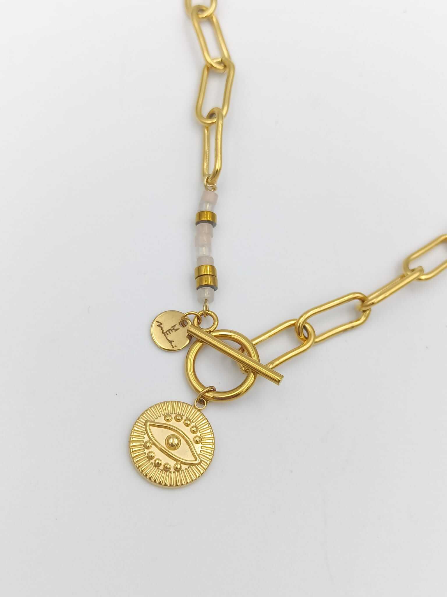 Collar Toggle con piedras Heishi y Hematites en cadena de eslabones XL en acero inoxidable con baño de oro 18 quilates Medida del collar 45cm + Cadena de Alargue de 5cm