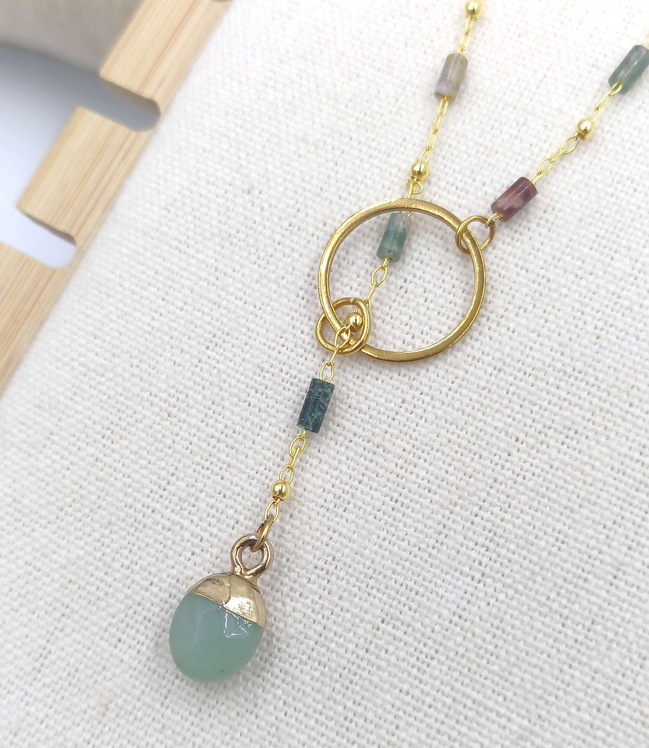 Corbatero Ágata con cadena brass con mini piedras ágatas dije en acero inoxidable con baño de oro 18 quilates y piedra semi preciosa