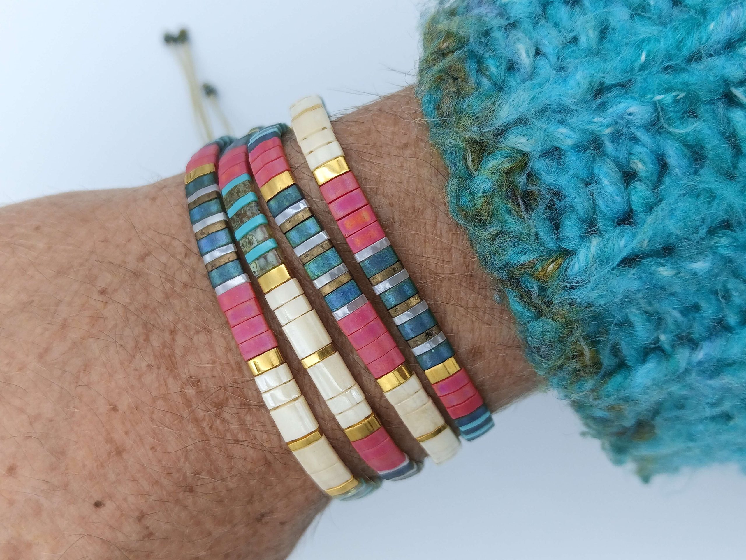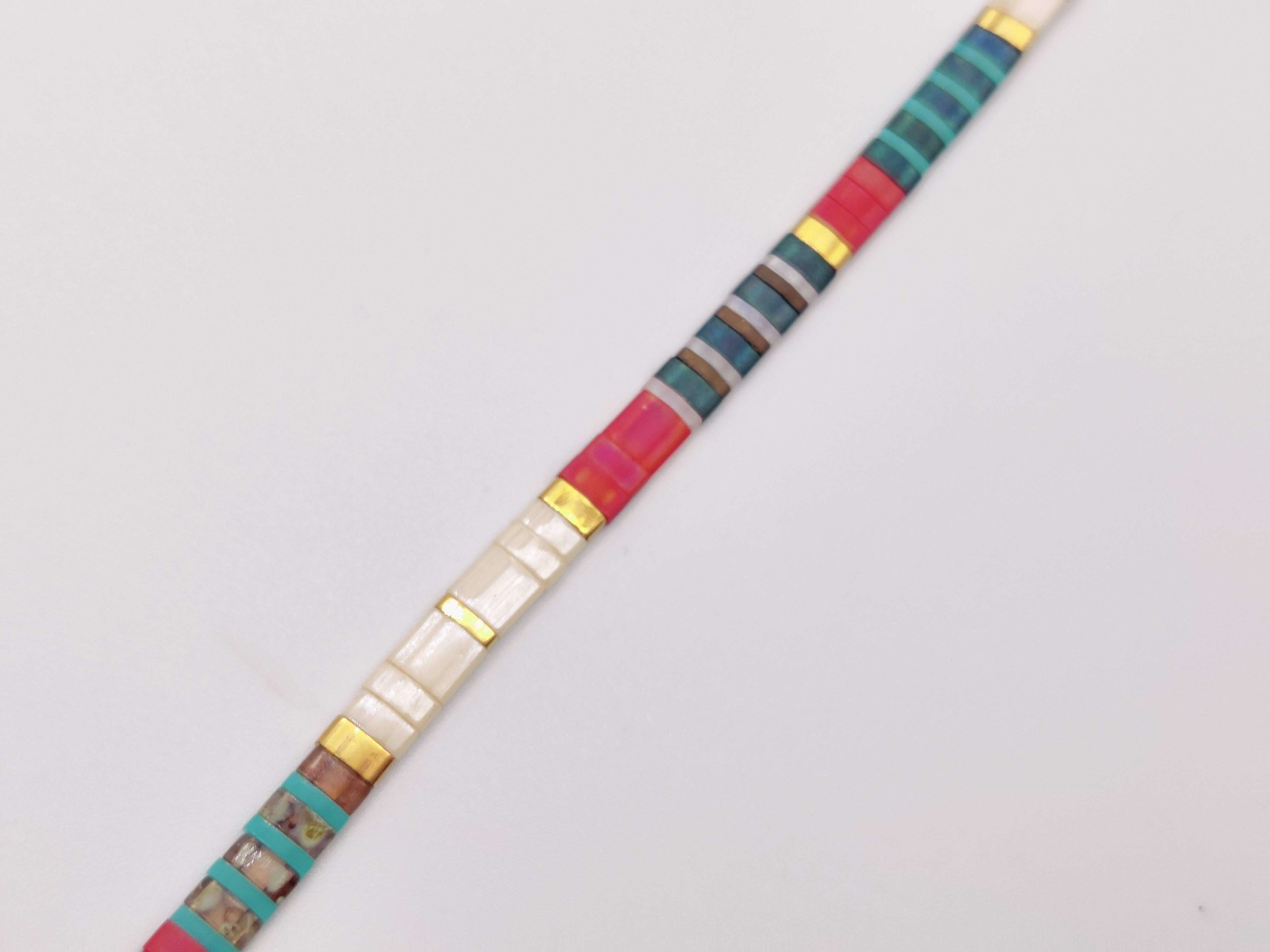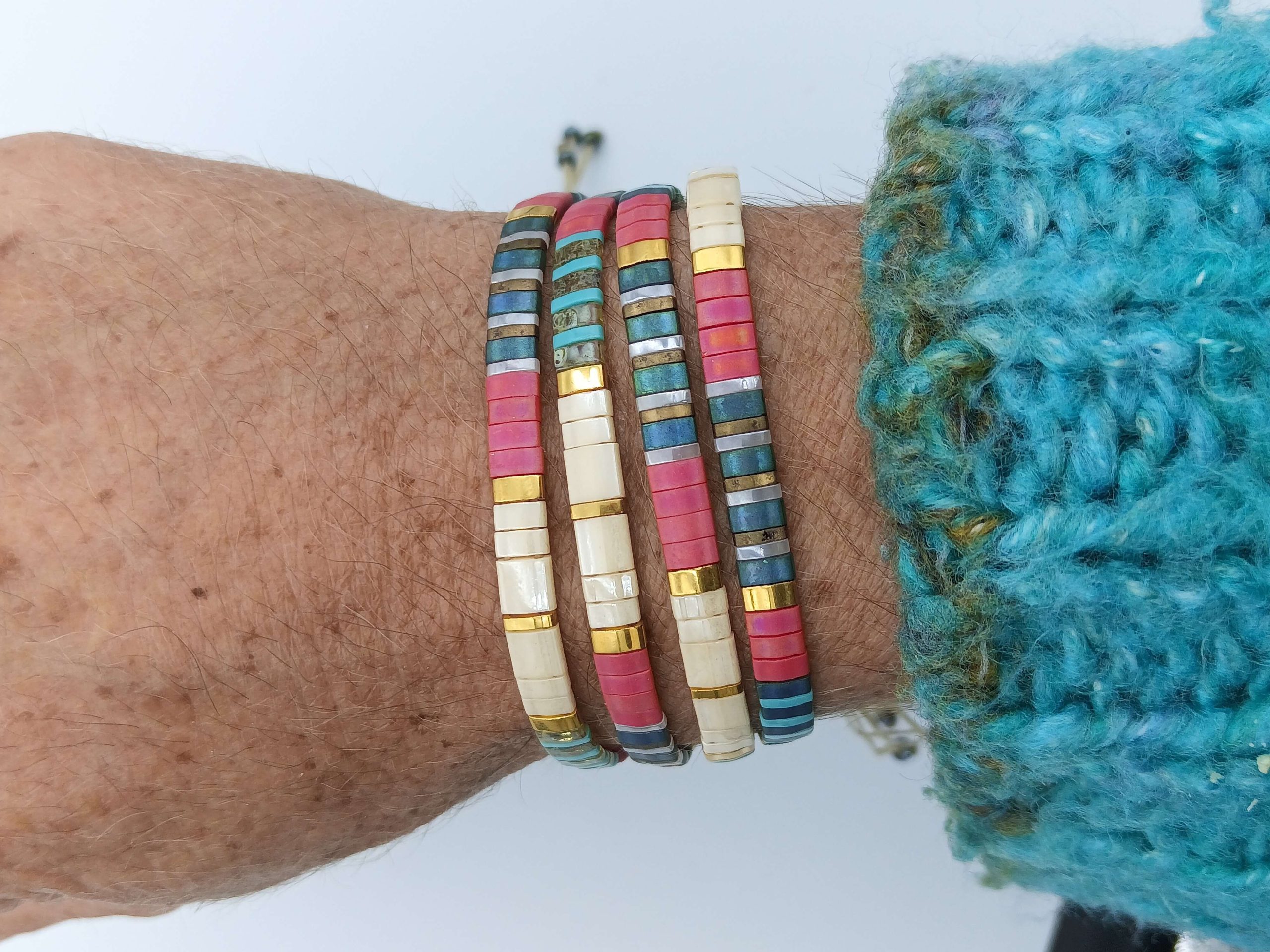 Pulsera Cristal Japones Hueso Fucsia Verde Tornasolado