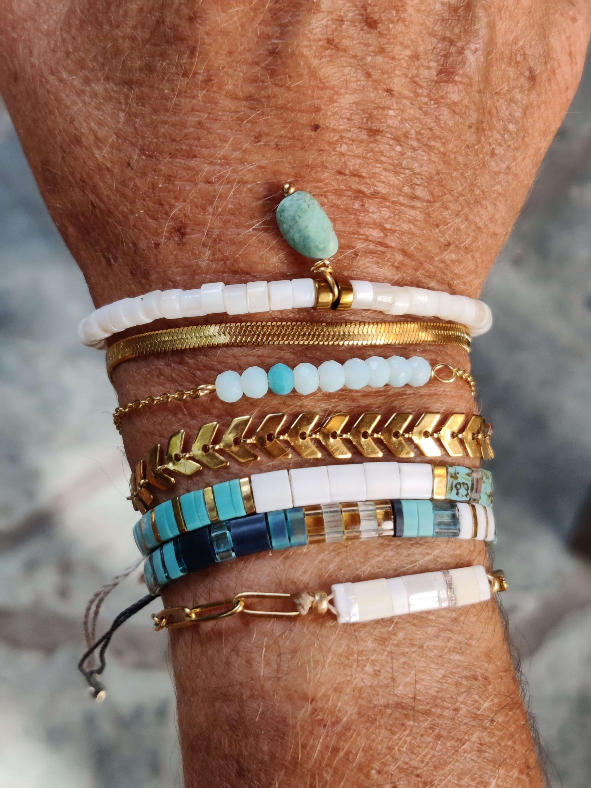 Pulsera Nácar blanco con hematites doradas y piedra semi preciosa ópalo rosa o amazonita verde o Dije Ginkgo y con cadena de acero inoxidable con baño de oro 18 quilates.