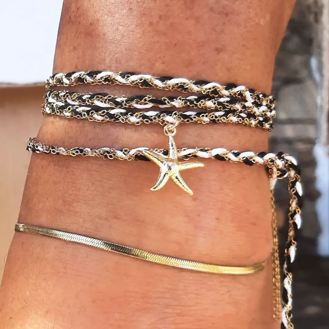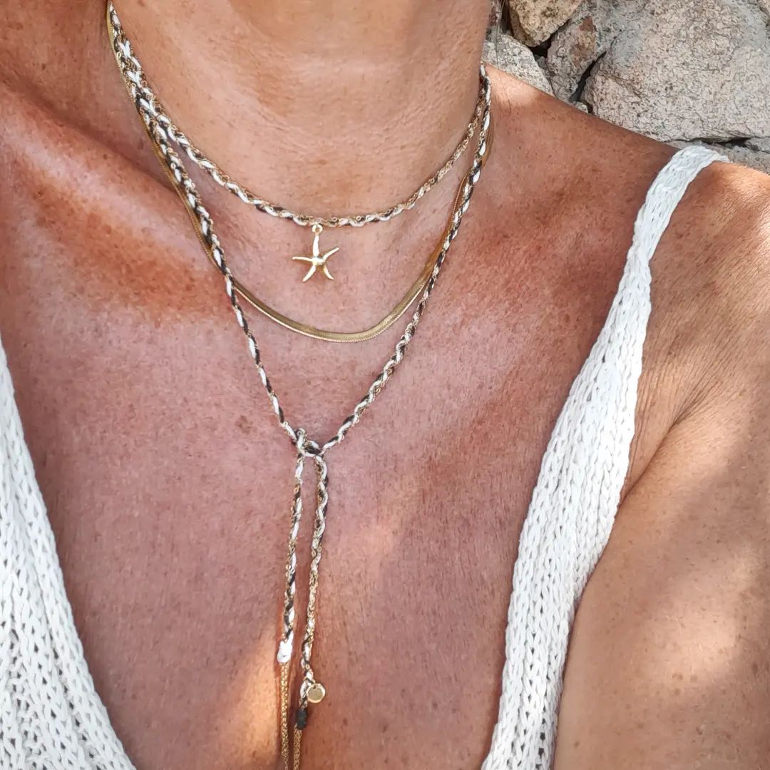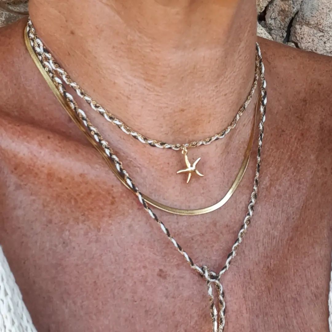 Trenza en hilo encerado y cadena de acero inoxidable con baño de oro 18 quilates. Con dije en acero y terminaciones con piedras.
